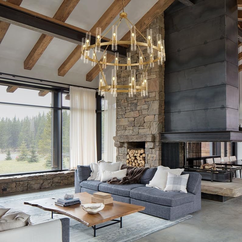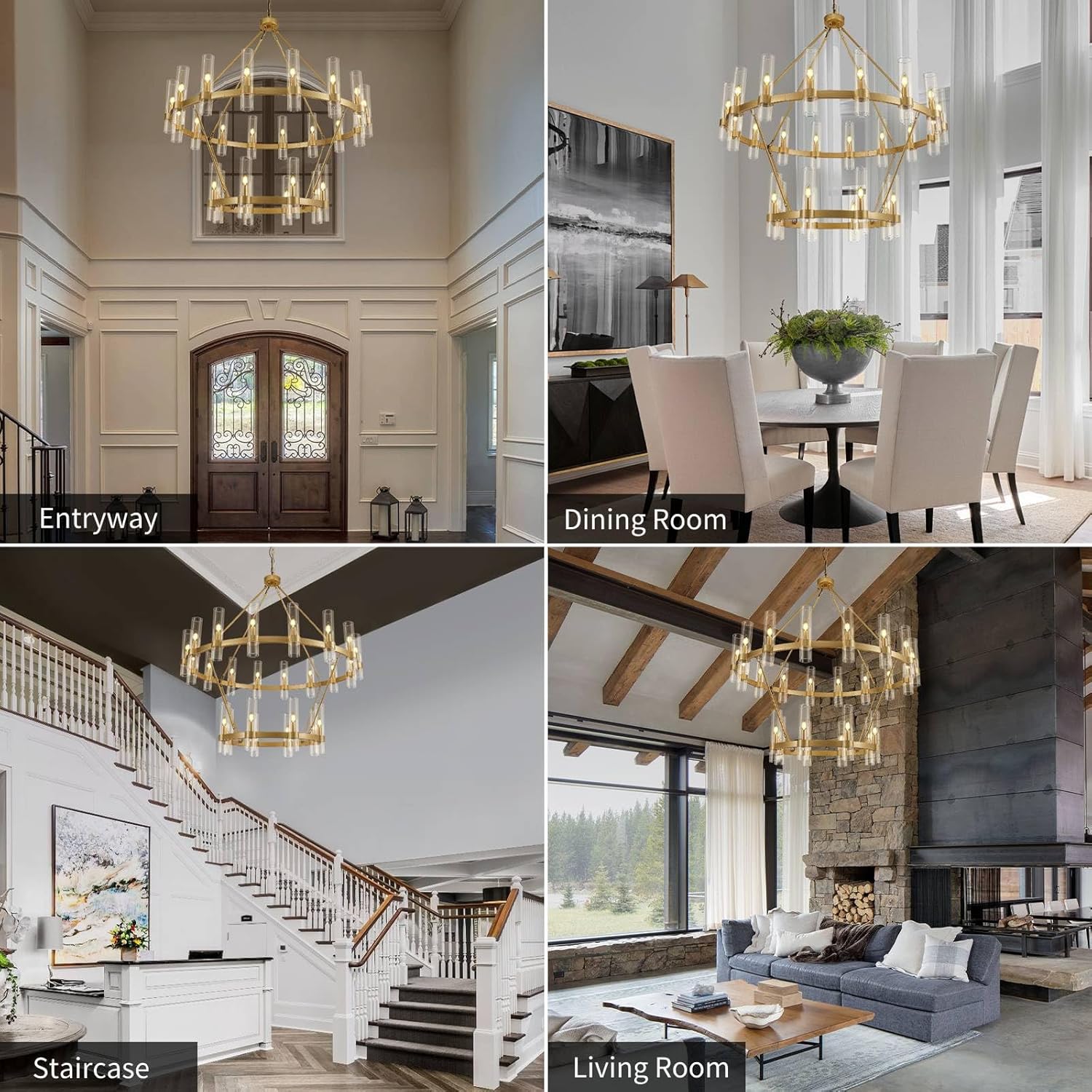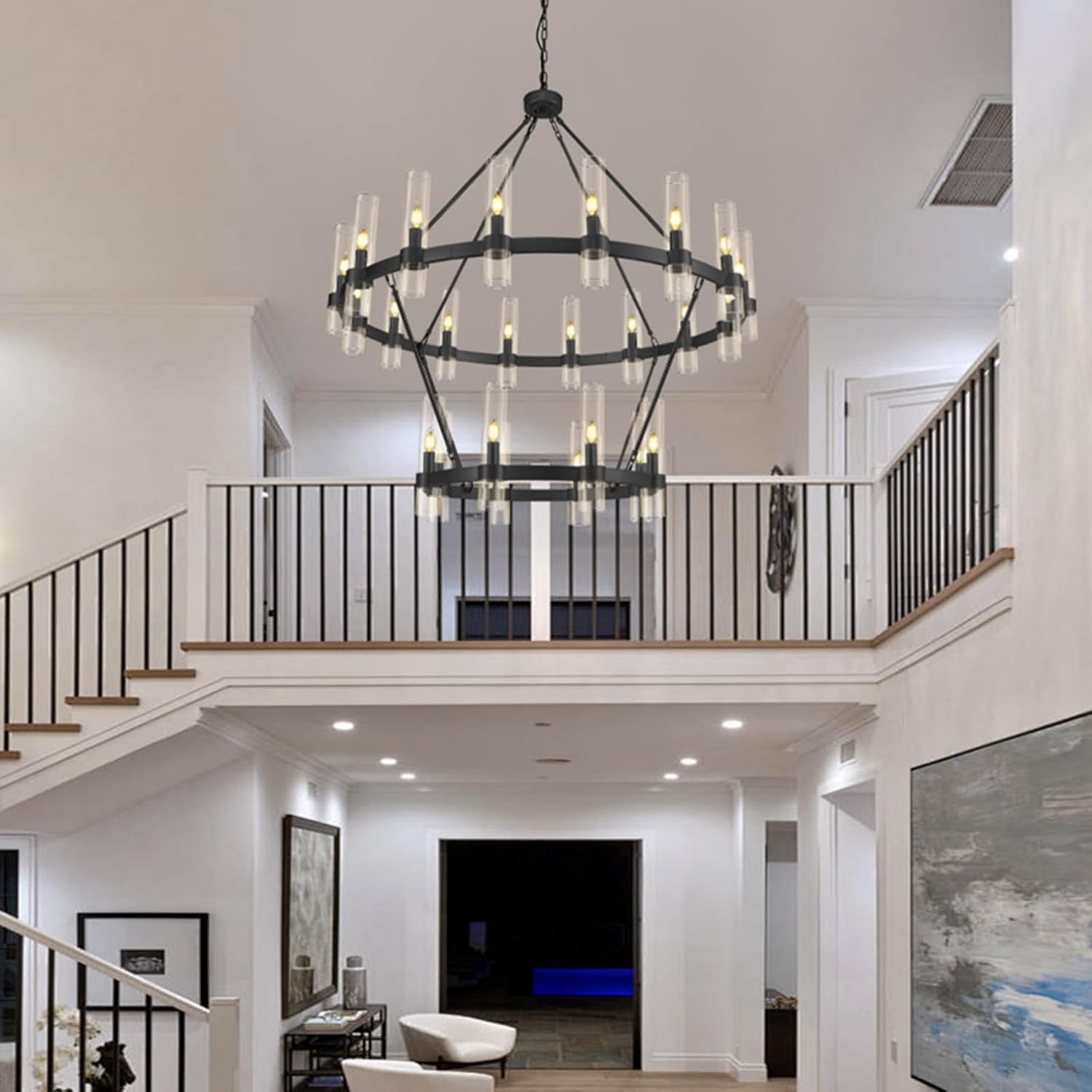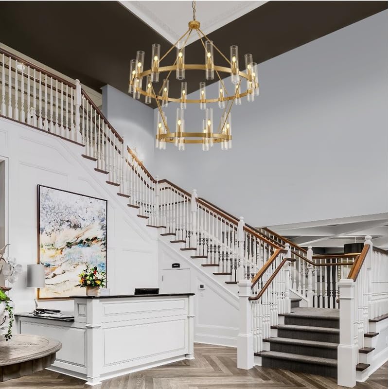 Besides the general rule that the chandelier’s bottom should be at least 7 and a half feet away from the floor. For two stories, what you also need to consider is how will it look from the second floor. In general, staircase chandeliers will be a good choice for space. In term of placing, below are two commonly seen guidance: